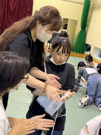 3年生は、担架を使用してのけが人の救助、包帯などでの応急処置を先生に指導してもらいながら行っていました。![]()
